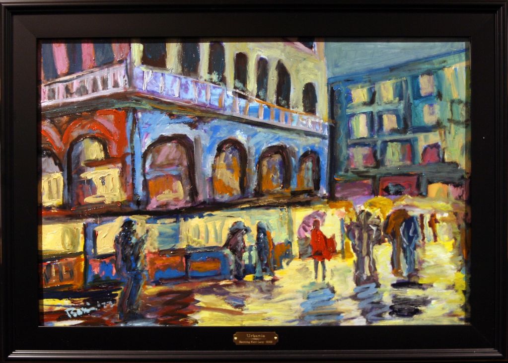Urbania 20" x 30" oil on wood panel in black wood frame with brass tag. This is from a photo I took in 2019 at Lake Como during the winter holidays where the public square is adorned with shops and they project wild images against the exterior walls. A special time in a special place. $850 delivered in the USA.
