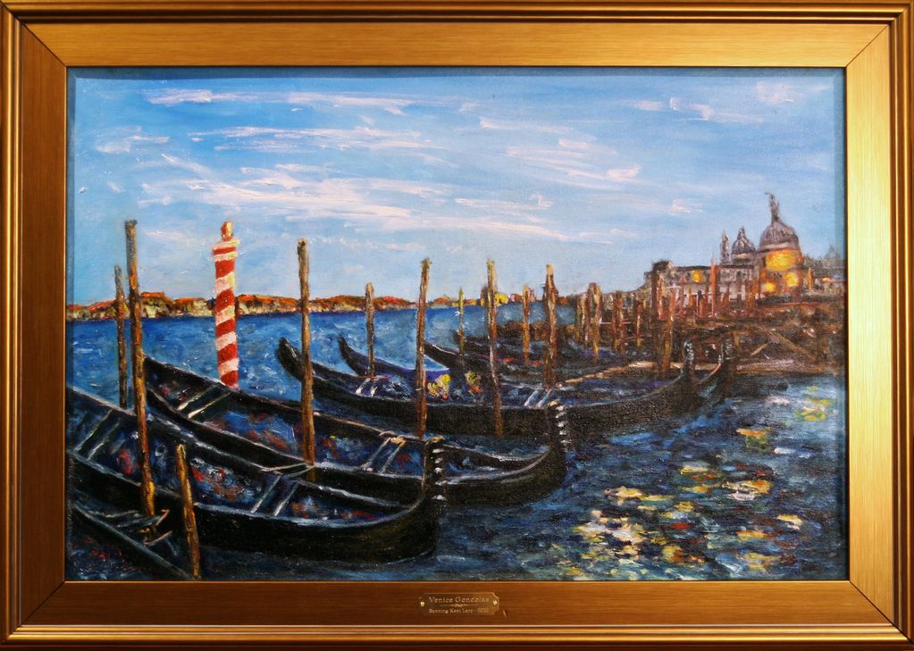 Venice Gondolas 20" x 30" oil on wood panel in gold frame with brass tag. We were in Venice during the floods of 2019 when St. Marks Square was flooded and people walked about on raised planks. The rough seas and inclement weather did little to dampen the majesty of this classic scene. $750 delivered in the USA.