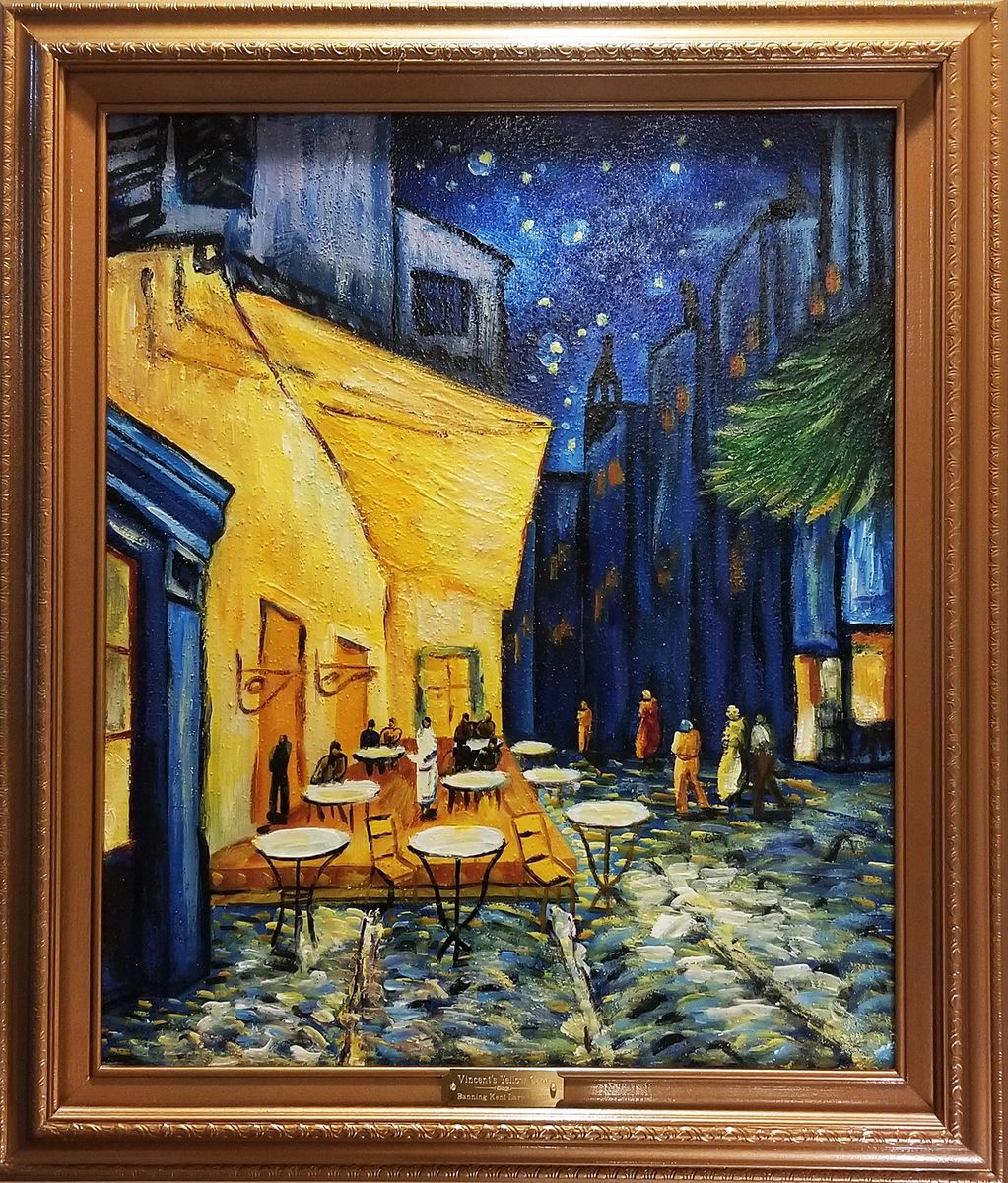 Vincent's Night Café (after Van Gogh) is, of course, a copy of his famous The Night Café 24" x 16" acrylic on canvas in gold frame. Van Gogh's original oil painting is 36" x 30" and was created in September 1888 in Arles, and is currently held at the Yale University Art Gallery in New Haven, Connecticut. Van Gogh's original is valued at $200 million. My homage is only $900 delivered in the USA.