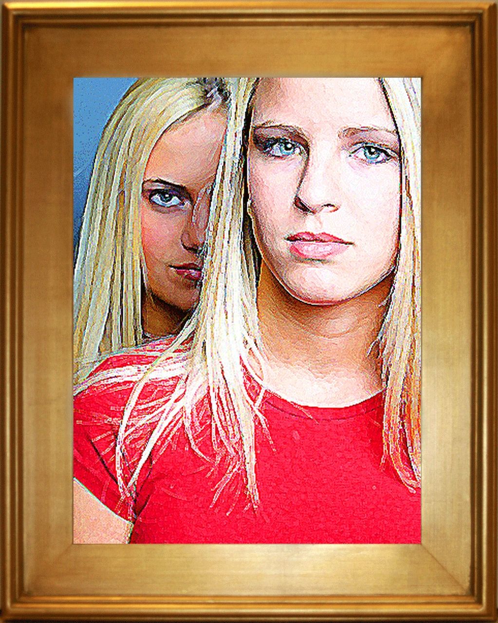 Amy and Kristin 30" x 20" acrylic on canvas panel in gold frame. This was done years ago of my daughter and her best friend using photo manipulation and acrylic. I tend to paint friends and family as do most artists but do accept the occasional commission, but only if I am allowed to interpret the subject as it paints itself on my psyche. NFS