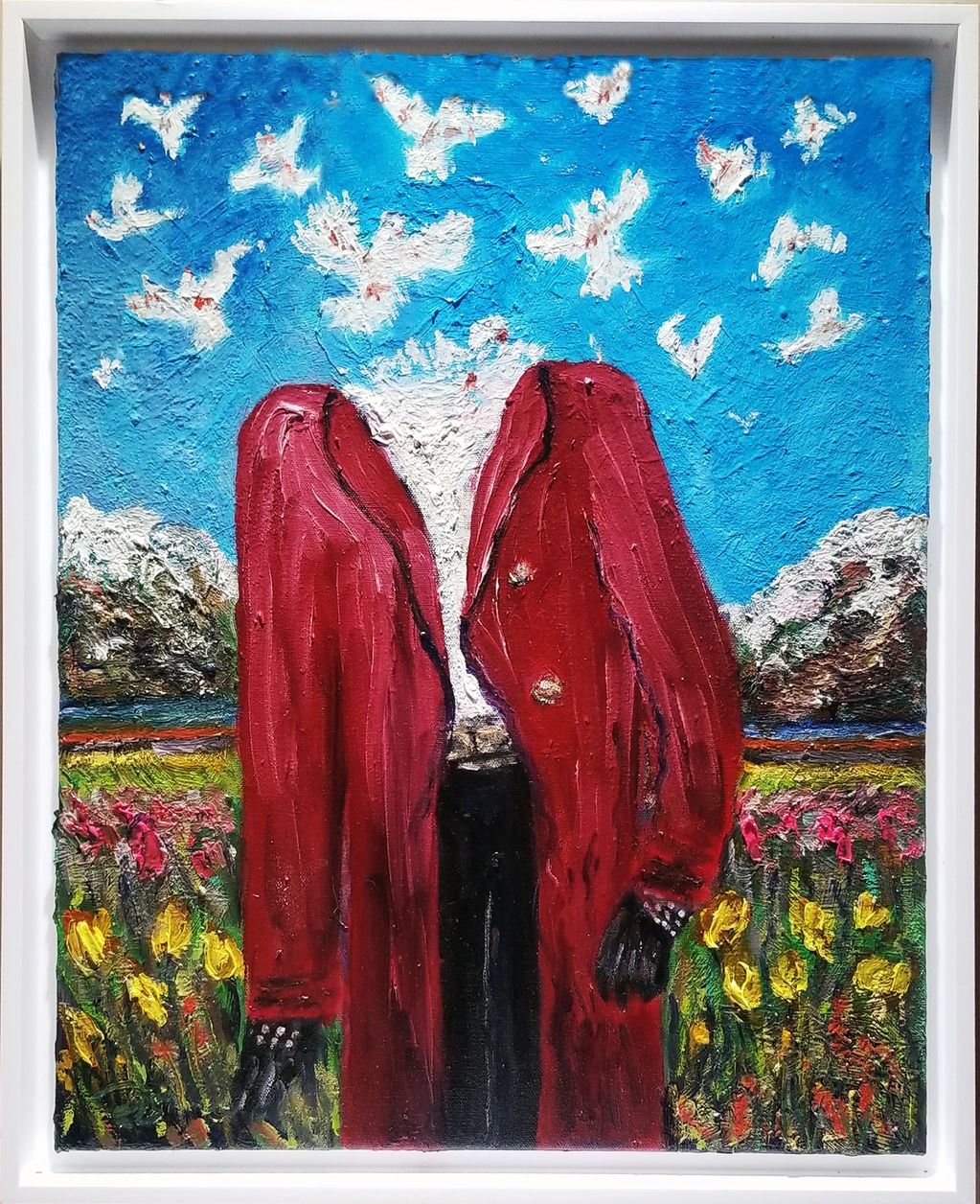Who Knew the Lady in the Red Coat was Really Turtle Doves 20" x 16" oil on canvas in white wood shadowbox frame. This whimsical piece stretched the concept of UltraRealism into the realm of the Surrealists. A special piece destined to be owned by an unusually astute collector. $650 delivered in the USA.